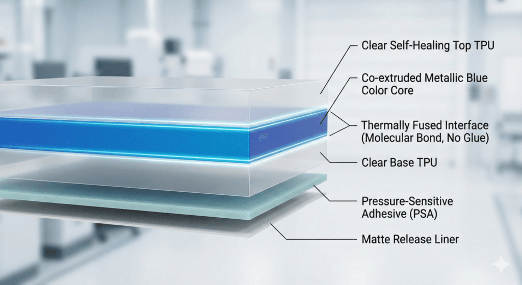 Otázka 3: Je „sendvičová“ struktura (TPU+Barva+TPU) vždy nejlepší volbou pro barevnou fólii? Odpověď: Je to varianta s „nejvyšším potenciálem“ pro prémiové značky, protože nabízí nejlepší hloubku, lesk a samohojivé vlastnosti. Není však nejsnazší na výrobu. Vyžaduje vysoce přesné stroje, aby se zabránilo „prosakování barvy“ nebo vnitřnímu oddělování vrstev. Je to nadřazená volba pouze v případě, že má výrobce ověřený proces kontroly kvality pro koextruzi [3].